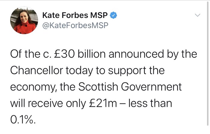 This tweet is so telling in that it deliberately attempts to conflate the Scottish Executive and the Scottish people themselves. A classic move straight out of the nationalist playbook. It’s a very deliberate tactic to portray Scots as being given a low level of support by the UK Government.