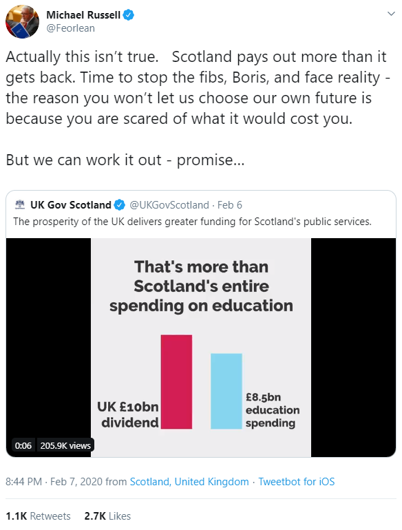 The common Nationalist assertion that Scotland raises much more in tax that it gets to spend is often quoted in memes and was endorsed by SNP cabinet secretary Mike Russell.