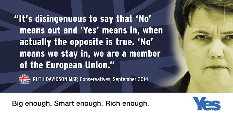 We start with a meme attributed to Ruth Davidson, Conservative leader in the Scottish parliament, during the Scottish referendum campaign. This is accurate… as far as it goes. Ms Davidson was pointing out the indisputable truth, that voting yes for Scottish separation in 2014 meant leaving the EU.