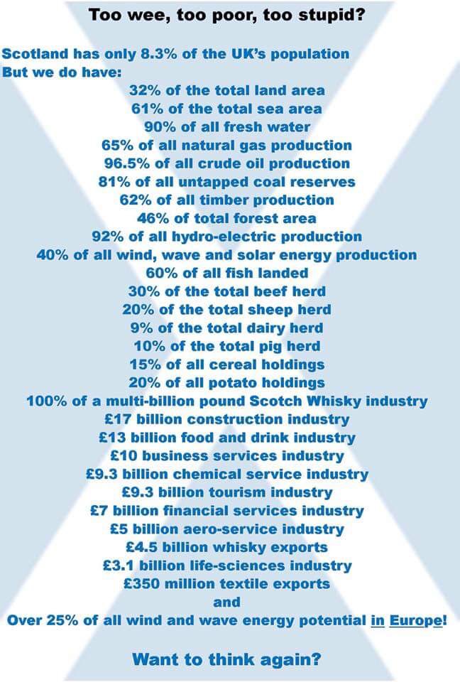 Finally, there are memes like this that feed on Scottish exceptionalism as an attempt to show that Scotland is richer than it actually is. I'll leave it to those who have more time on their hands to go through line by line, but its claims have little relevance to the actual economy, Scotland's negative balance of payments, nor the £13 billion annual deficit that Scotland incurs.