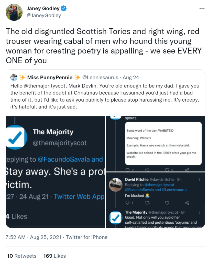 The @themajorityscot and the right wing angry men hounded this poet for months - of course George Galloway joined in and they made a wee circle of older angry men - staring down a young lassie performing poems - creepy as fuck