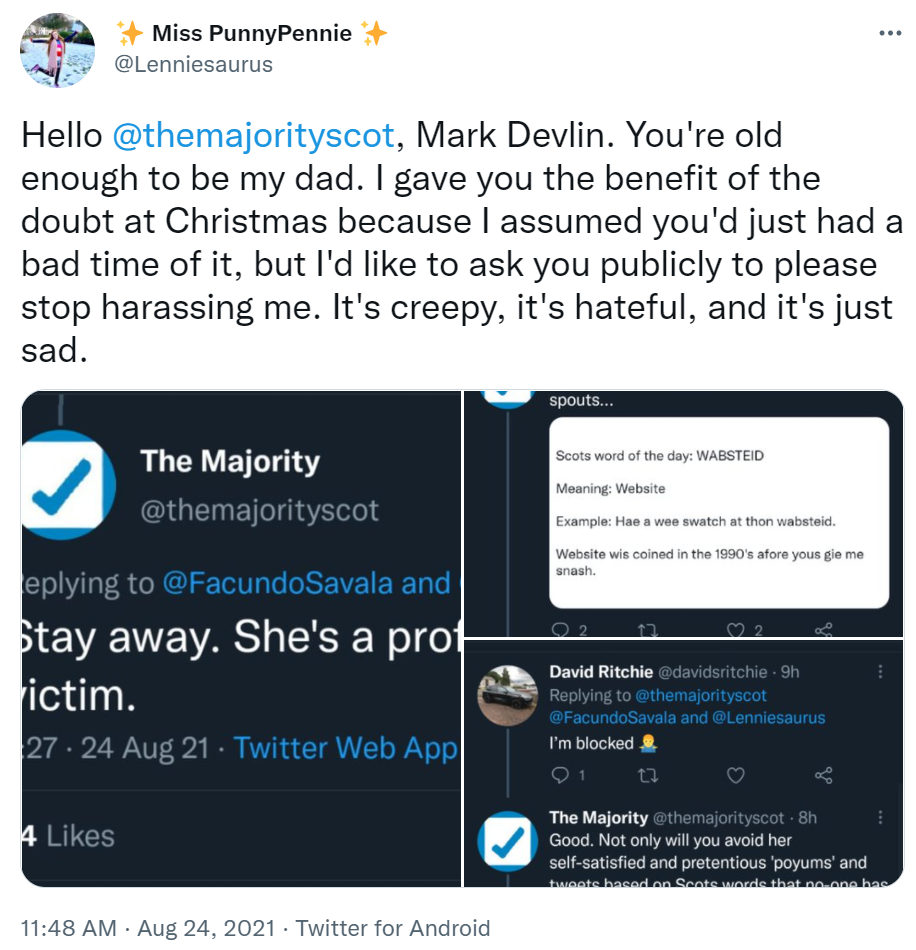 On August 24, Len Pennie, a 21-year-old woman who posts poetry and 'Scots Word of The Day’ videos on social media, under the name Miss PunniePennie (@lenniesaurus), made a false allegation that I harassed her, while claiming I am ‘creepy’ and ‘hateful’. Previously Pennie claimed I was a ‘bigot’ and a ‘bully’.
