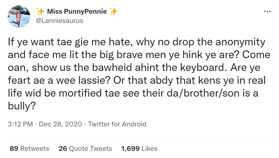 If ye want tae gie me hate, why no drop the anonymity and face me lit the big brave men ye hink ye are? Come oan, show us the bawheid ahint the keyboard. Are ye feart ae a wee lassie? Or that abdy that kens ye in real life wid be mortified tae see their da/brother/son is a bully?