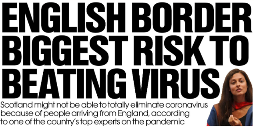 There is about to be a massive second wave of this new virus in England due to Tory ineptitude. The borders of both Scotland and Wales should be closed to all but essential traffic ie commerce. Not casual trips that are in fact international from a COVID hot spot about to get worse.