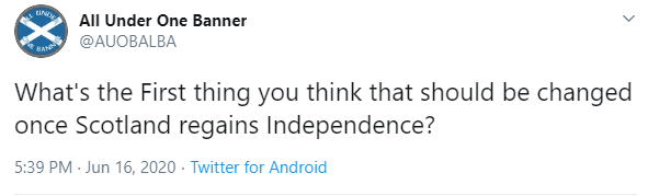 I've been in chats with quite a few of these marchers who claim their Nationalism is "civic and joyous". Yet is that really true? Yesterday, AUOB asked the question, "What's the first thing that should be changed once Scotland regains independence?"